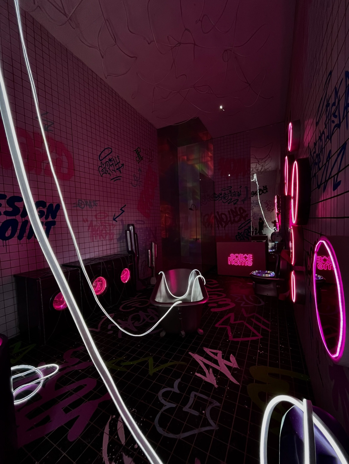 MO4's very own "SCENE HOME" at 2024 Cairo Design Week. Graffiti work all over the FUNKY FLUSH disco bathroom.